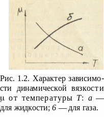 Вязкость жидкостей и газов существенно зависит от температуры, причем с ростом температуры вязкость газов возрастает, а жидкостей — падает (рис. 1.2).