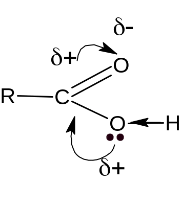 Рассмотрим распределение электронной плотности в карбоксильной группе недиссоциированной карбоновой кислоты. Электронная плотность -