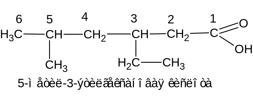 Для наименования карбоновых кислот широко применяются тривиальные названия, которые часто связаны с первыми источниками их получения: муравьиная, уксусная, стеариновая. По номенклатуре ИЮПАК в основе наименования кислот положено название углеводорода с тем же числом атомов углерода, к которому прибавляется суффикс с окончанием «овая», нумерация начинается с атома углерода карбоксильной группы: