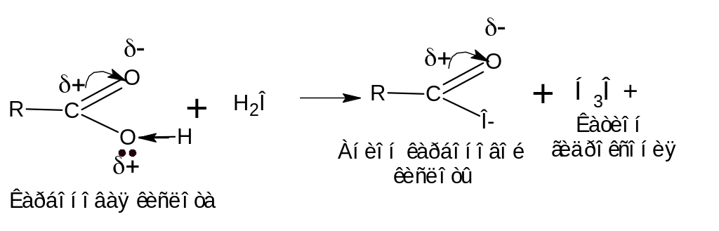 связи в группе смещена в сторону атома кислорода. Вследствии этого у атома углерода создается недостаток электронной плотности, и он притягивает к себе неподеленные электронные пары от кислорода гидроксильной группы. В результате электронная плотность О–Н-связи смещается в сторону атома кислорода, водород становиться подвижным и приобретает способность отщепляться в виде протона: