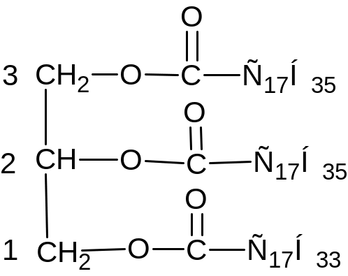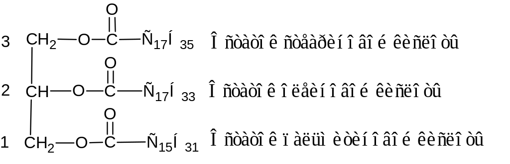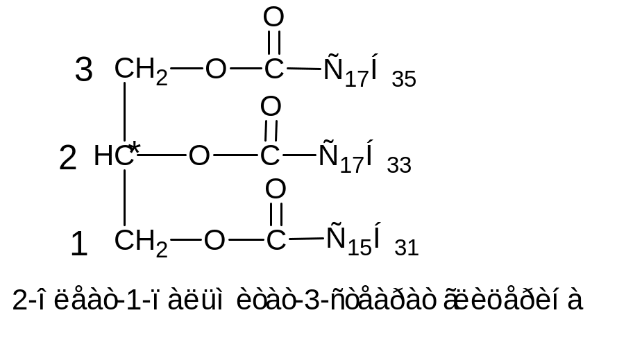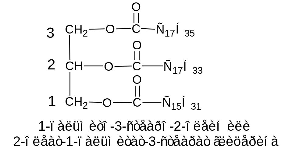 1. Первыми называются остатки кислот с более короткой углеродной цепью. Например, 1-пальмито-2,3-дистеарин (полный смешанный насыщенный глицерид)