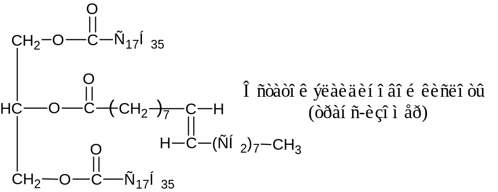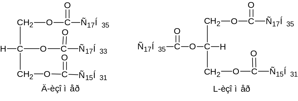 Оптически активные изомеры существуют у тех смешанных триглицеридов, которые имеют асимметрический атом углерода, возникающий при наличии различных заместителей у 1 и 3 углеродных атомов. Например, в 1-пальмито-3-стеаро-2-олеине второй углеродный атом асимметричен. В центре этот глицерид записан в общем виде. Слева и справа приведены конфигурации двух Д- и L-изомеров, отличающихся расположением заместителей у асимметрического атома углерода.
