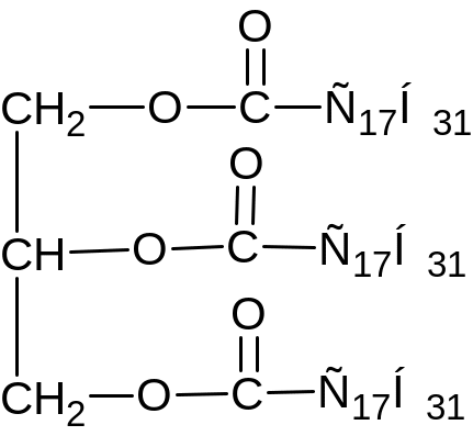 На основании рентгеноструктурных исследований кристаллов триглицеридов установлено, что молекулы однокислотных насыщенных триглицеридов (содержат три одинаковых остатка одной кислоты) имеют структуру «камертона» или вилки, два зубца и ручка которой, представляющие радикалы жирной кислоты, расположены практически в одной плоскости: