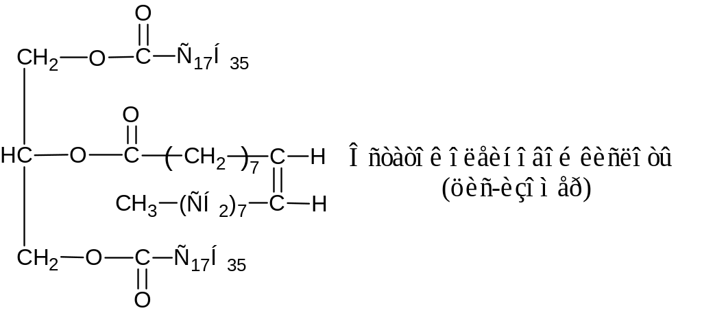 Ниже приведены формулы цис- и транс-изомеров 1,3-дистеаро-2-олеина или 2-олеата-1,3-дистеарата глицерина.