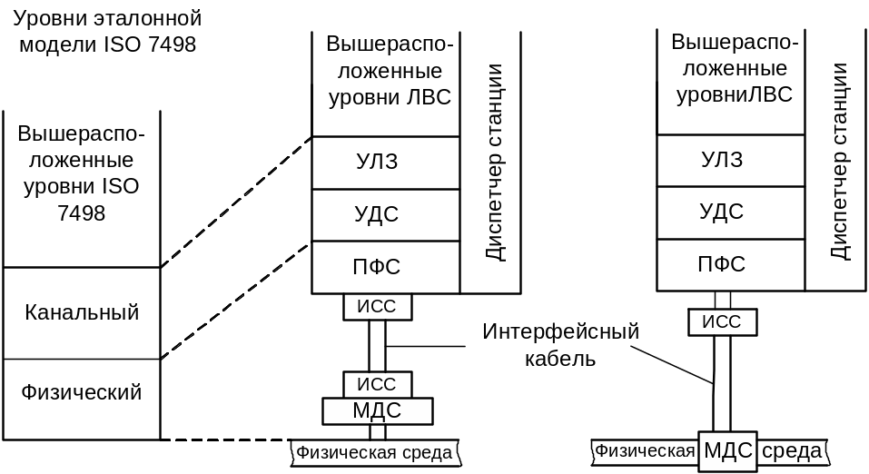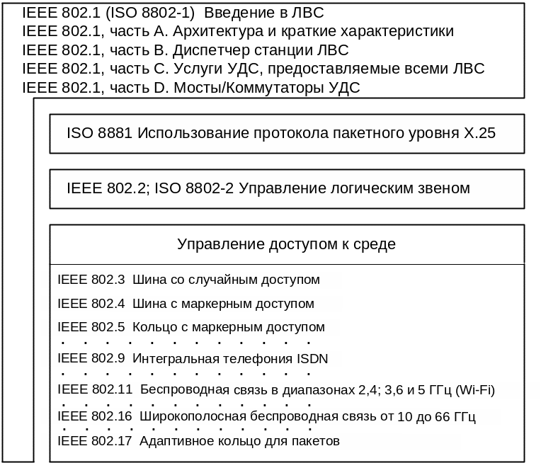 Согласно проекту IEEE 802 в ЛВС выполняются функциональные задачи двух нижних уровней стандарта ISO 7498 канального и физического. Канальный уровень делится на два подуровня: