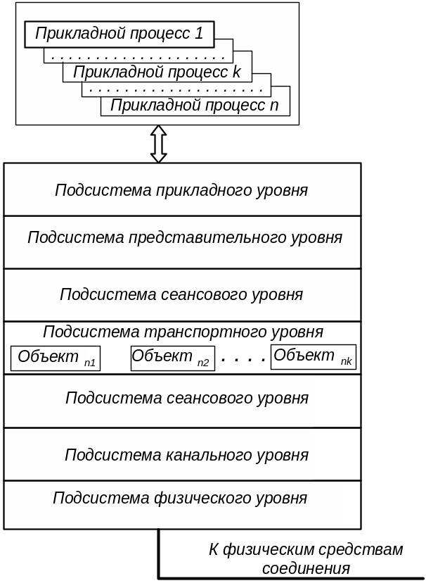 Каждая из подсистем обеспечивает решение некоторого подмножества вполне определенных, присущих только этой подсистеме, логически обособленных функциональных задач и имеет имя собственное Прикладная, Представительная, Сеансовая, Транспортная, Канальная и Физическая. Точно так же каждая из подсистем допускает дальнейшую декомпозицию и представляется множеством функций и присоединенных к ним процедур. Функция и присоединенные к ней процедуры определяется стандартом ISO 7498 как объект соответствующей функциональной N-подсистемы N-объект. Таким образом, каждая функциональная подсистема состоит из одного или нескольких N-объектов, каждый из которых выполняет вполне определенные функции при исполнении присоединенных к ним процедур. На рисунке показаны только объекты подсистемы транспортного уровня (N=4).