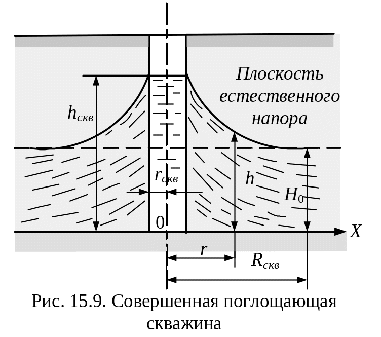 Совершенная артезианская скважина. Такая скважина (рис. 15.10) прорезает верхний водоупорный пласт, водоносный пласт и доходит до нижнего водоупорного пласта. Грунтовые воды полностью заполняют водоносный пласт и находятся под давлением, большим чем атмосферное. При отсутствии движения плоскость естественного напора располагается на некоторой высоте Н0 от поверхности нижнего водоупорного пласта, которая соответствует естественному напору. Давление в водоносном пласте может быть столь большим, что плоскость естественного напора располагается выше отметок земли (фонтанирующие или самоизливающиеся скважины).