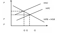 В зависимости от характера последствий экстерналии делятся на отрицательные (негативные) и положительные. Отрицательные внешние эффекты возникают, когда деятельность экономических субъектов наносит ущерб третьим лицам, не участвующим в рыночной сделке, что приводит к приросту затрат третьих лиц, не включаемых в издержки производства и предельные частные издержки производства меньше предельных социальных издержек. Следствием отрицательного внешнего эффекта является перепроизводство блага и занижение его цены: производится Q вместо Q и реализуется по цене Р вместо P . Таким образом, не включение части издержек производства в цену продукции равносильно бесплатному использованию ресурсов (чистого воздуха, воды, и др.) и внешние издержки не находят адекватного возмещения в процессе рыночного обмена (рис.3).