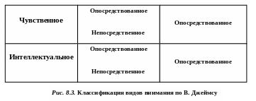 Джеймс предложил одну из самых многоаспектных классификаций внимания (Рис. 8.3), выделив шесть видов по критериям произвольности, направленности (на внешний или субъективный внутренний мир субъекта) и способу связи акта внимания с наличным мотивационным состоянием (непосредственно или через ассоциативную связь).