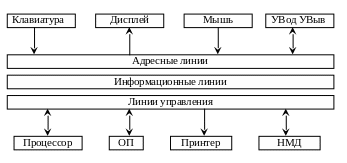 Особенностью современных персональных компьютеров является модульный принцип построения. Каждый функциональный блок компьютера (блок) подключается к магистрали (системной шине) с помощью типовых разъемов, расположенных на материнской плате. Обмен информацией между модулями осуществляется через системную шину. С ее помощью процессор получает данные из оперативной памяти компьютера и результаты обработки по той же шине отправляет в память. К системной шине могут подключаться любые устройства ввода и вывода. Эта шина обеспечивает обмен данными процессора между всеми устройствами системы[4. С. 30-31]. Как движется информация можно проследить по структурной схеме ПК изображенной на рис. 3 . на схеме показана системная шина, состоящая из адресных, информационных линий и линий управления. Унификация способа обмена между блоками (модулями) ПК позволила легко решить задачу изменения типовой конфигурации компьютера.