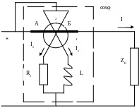 Если ток 1=2, а фазовый сдвиг между токами 1 и 2 будет равен углу между подвижными катушками L, то угол отклонения указателя будет равен фазовому сдвигу между U и I в нагрузке.