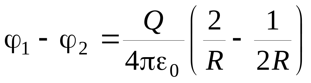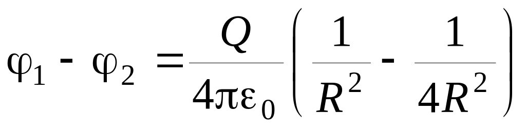 .По поверхности сферы радиуса R однородно распределен заряд Q. Разность потенциалов в точках 1 и 2, расположенных соответственно на расстояниях R/2 и 2R от центра сферы, равна: