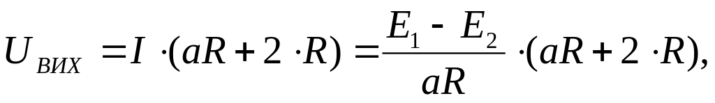 Оскільки диференційна вхідна напруга кожного ОП дорівнює 0 В, напруги в точках 1 і 2 (відносно землі) рівні відповідно Е1 і Е2. Звідси випливає, що на резисторі aR падає напруга E1—E2 (зазначеній на схемі полярності цієї напруги відповідає випадок, коли Е1 >Е2). Резистор aR — змінний; він використовується для регулювання коефіцієнта підсилення. Через резистор aR протікає струм: