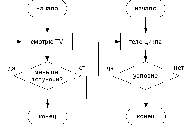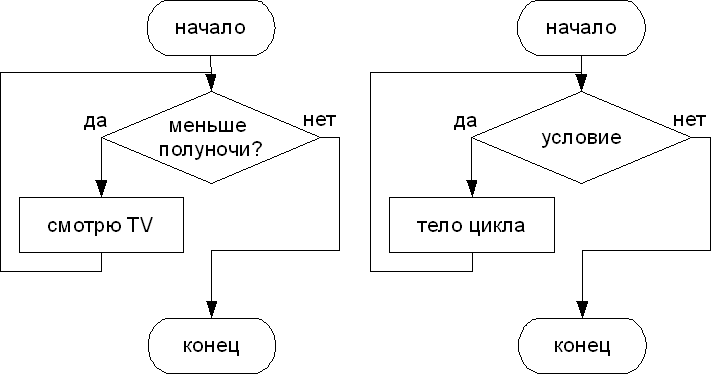 Например, в субботу вечером вы смотрите телевизор. Время от времени поглядываете на часы и если время меньше полуночи, то продолжаете смотреть телевизор, если это не так, то вы прекращаете просмотр телепередач.