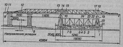 1,9 — трёхосные тяговые тележки; 2 — рама; 3 — силовая установка; 4 — пульт управления платформой; 5 — кабина управления; 6 — электрооборудование платформы; 7, 13, 15 — лебёдка; 8 —траверса грузовая; 10,11 — блок; 12 — стрела; 14 — пульт; 16 — средняя поперечная балка; 17 — ограничитель грузоподъёмности; 18 — откидные балки; 19 — каретка портала; 20 — гидроцилиндры подъёма стрелы; 21 — стойка портала; 22 — ограждение; 23 — роликовый конвейер; 24 — электрооборудование на стреле