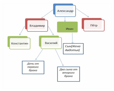 При перечислении членов семьи следует отметить,что Александр-отец троих сыновей:Владимира-старшего,Константина и Петра. У Владимира,в свою очередь,было два сына-Константин и Василий.Каждый из них «внёс свою лепту» в развитие предпринимательства и историю своей семьи.Нагляднее родство Ненашевых можно разглядеть на данной схеме.К сожалению,имена женщин в архивах найдены не были.