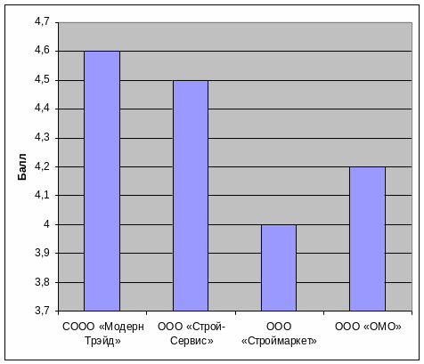 Расчет комплексных показателей конкурентоспособности указывает на высокую конкурентоспособность исследуемой организации. СООО «Модерн Трэйд» отличается от остальных своих конкурентов удобной транспортной и географической доступностью. Качество продукции на предприятии, а также цены на продукцию находятся примерно на одном уровне во всех исследуемых организациях.