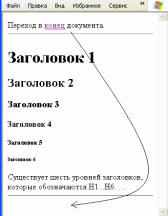 <HTML> <HEAD> <TITLE>Переход по меткам внутри одного документа</TITLE> <BODY leftmargin=300> <P>Переход в <A href=#finish> конец</A> документа. <HR> <H1>Заголовок 1</H1> <H2>Заголовок 2</H2> <H3>Заголовок 3</H3> <H4>Заголовок 4</H4> <H5>Заголовок 5</H5> <H6>Заголовок 6</H6> <P> Существует шесть уровней заголовков, которые обозначаются H1...H6. <HR> <A name=finish> </BODY> <HTML> |