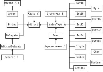 В .NET Framework сглажено различие между типами и классами. А именно, любой тип можно воспринимать как класс, который может быть связан с другими типами (классами) отношением наследования. Это позволяет рассматривать все типы .NET Framework (и языка C#) в виде иерархии классов. При этом существует базовый тип System.Object (в C# – object), являющийся общим предком всех типов. Все структурные типы наследуются от класса System.ValueType.