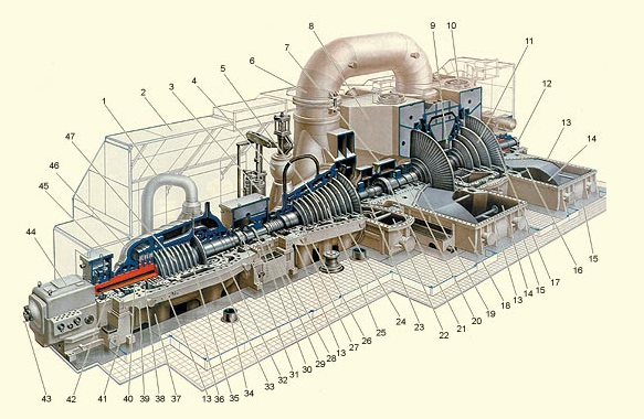 Типичная паровая турбина показана на рис. 4.9.1. Для того чтобы увидеть внутреннее устройство турбины, при ее изображении «вырезана» передняя верхняя четверть. Точно также показана лишь задняя часть кожуха 2. Турбина состоит из трех цилиндров (ЦВД, ЦСД и ЦНД), нижние половины корпусов которых обозначены соответственно 39, 24 и 18. Каждый из цилиндров состоит из статора, главным элементом которого являются неподвижный корпус, и вращающегося ротора. Отдельные роторы цилиндров (ротор ЦВД 47, ротор ЦСД 5 и ротор ЦНД 11) жестко соединяются муфтами 31 и 21. К полумуфте 12 присоединяется полумуфта ротора электрогенератора (не показан), а к нему — ротор возбудителя. Цепочка из собранных отдельных роторов цилиндров, генератора и возбудителя называется валопроводом. Его длина при большом числе цилиндров (а самое большое их число в современных турбинах — 5) может достигать 80 м.