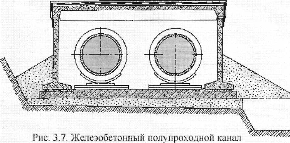 Непроходные каналы (рис. 5.2.2) позволяют разместить в себе только подающий и обратный теплопроводы, для доступа к которым необходимо срывать слой грунта и снимать верхнюю часть канала. В непроходных каналах и бесканально прокладывается большая часть теплопроводов.