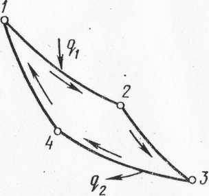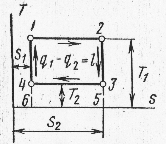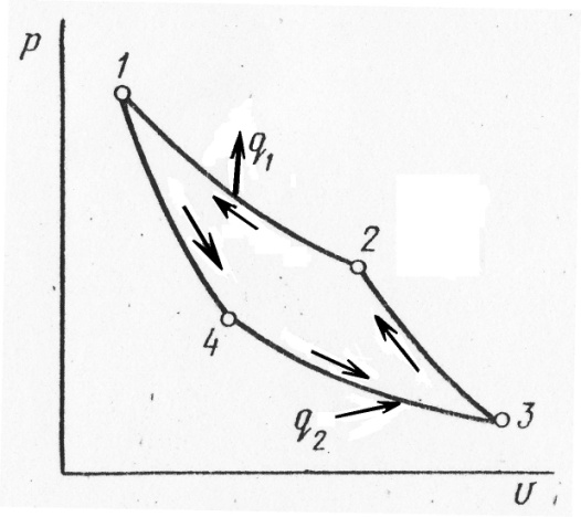 Рабочее тело от начальной точки 1 расширяется по адиабате 1-4 без теплообмена с внешней средой, при этом температура уменьшается до . Затем следует дальнейшее расширение газа по изотерме 4-3 с подводом теплоты , которое отнимается от источника с низкой температурой . Далее следует адиабатное сжатие 3-2 с увеличением температуры рабочего тела от до . В течение последнего процесса происходит изотермическое сжатие 2-1, во время которого к теплоприемнику с высокой температурой отводится удельное количество теплоты .