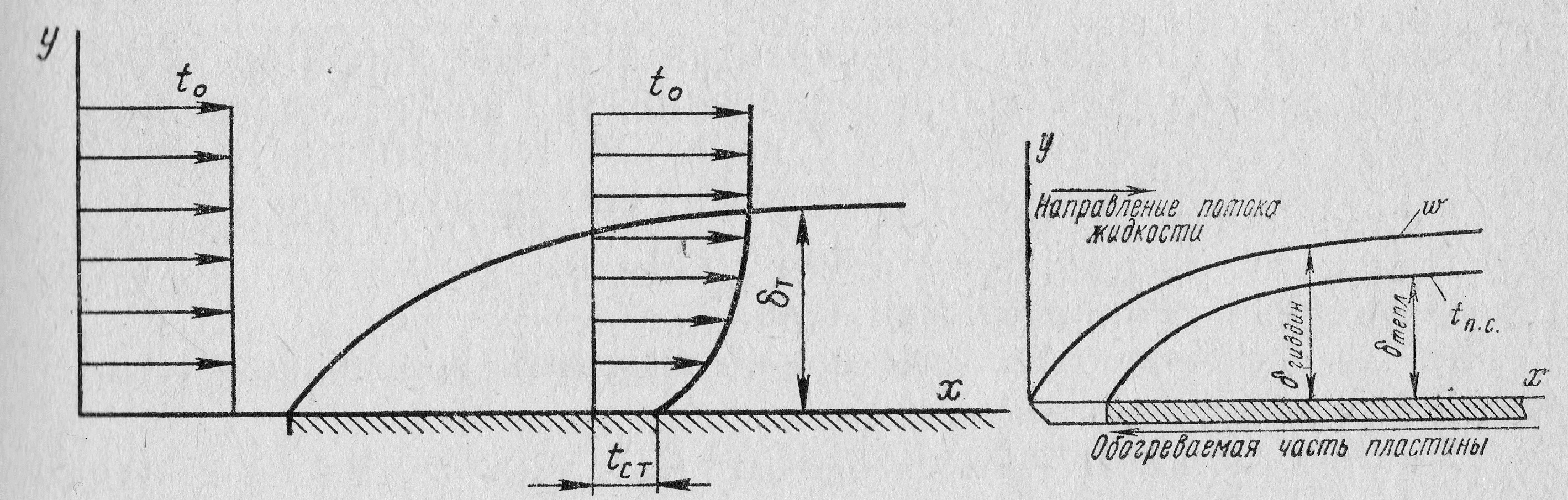 Механизм и интенсивность переноса теплоты зависят от характера движения жидкости в пограничном слое. Если движение внутри теплового пограничного слоя ламинарное, то теплота в направлении, перпендикулярном стенке, переносится теплопроводностью. Однако у внешней границы слоя, где температура по нормали к стенке меняется незначительно, преобладает перенос теплоты конвекцией вдоль стенки.