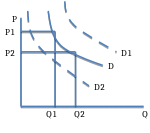 Точно также цены и на товары заменитела, когда мы рассматриваем один фактор вниз или вверх. Когда рассматриваем одновременные действия всех этих факторов, то происходит увеличение совокупного объёма спроса. Либо перемещается в положение D1 либо может переместится в положение D2. Что означает движение из положения D в положение D1? – увеличение совокупного спроса.