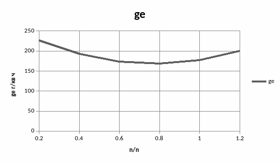 Таблица 4.1- Зависимость мощности Pe, вращающего момента Tе, удельного расхода ge и массового расхода Ge от частоты вращения коленвала ne