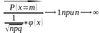 Локальная теорема: если вероятность наступления события А постоянна и равна р в каждом из n независимых испытаний, 0<p<1,то для вероятности Р(х=m) того, что событие А наступит ровно m раз, справедлива асимптотическая формула