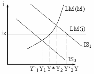 рассмотрим случай увеличения количества денег в обращении (рис.1 -ДКП при изм-ся ур цен) изображен случай, когда линия IS пересекает кривую LМ на ее наклонном участке. Ф предл не имеет выраженного кейнс или класс наклона. Ув-е кол-ва денег в обр вызвало смещ кривой LМ0 в полож LМ1. Ум-е с% спос росту спроса, и ф сов спроса смест в полож АD1. Однако при ур цен P0 на тов рынке образ деф. Деф вызвал рост общ ур цен. Рост Ур цен, с одн ст, увеличил сов предл, с др ст, через смещ линии LМ1 в полож LМ2 погасил сов спрос. В итоге новое равнов -в т Е2. Если ф сов предл имеет кейнс (гориз вид), то цены не меняются и не оказ отриц влияния на мул-р. Если, наоборот- рост предл денег вызовет лишь рост цен, не увеличив нац доход. В усл рын хоз-ва для денежных властей всегда стоит вопрос, что рег-ть для лучшего возд на конъюнктуру – объем ден массы или с%. Однозн ответа нет. Чисто теор-ки выбор объекта рег-я зависит от того, что явл ист нестаб спроса – рын благ (смещ IS) или рын денег (LM). Вопрос поставлен теор-ки – т корганы, отвеч за ден пол, не могут точно опр ист-к нестаб спр. Допустим, что ист-к - линия IS. Рис.2 иллюстр посл-я изм ден массы и фиксации с% в этой ситуации. целью ден властей явл макс прибл эк к Y*, при этом линия IS смещ из IS0 в IS1. Линия LМ отраж политику, при кот фик-ся ден масса; линия LМ(i) – политику фикс-ии с%. Из графика видно, что политика фикс ден массы более эфф. Это связ с тем, что, когда IS смещ вправо (например, в силу того,что растет инв спрос), кол-во денег ост неизм. В рез возр с%, что частично гасит возр инв спрос. Теперь предп, что ист нест явл сдвиг LМ (рис. 3). Сдвиги LМ в интервале между LМ1 LМ2 связ с изм спроса на деньги. Если ЦБ сохраняет стаб предл денег, то изм спроса на деньги сопров изм с% в интерв i1 – i2 и соотв откл Y от Y*. Если же ЦБ изм предл денег вслед за изм спроса, то с% остается стаб. А вслед за ней ост стаб и нац доход (Y*).
