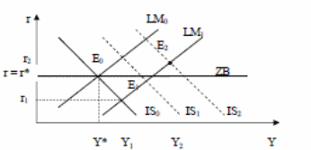 В усл-х, когда уровень цен явл фиксир, в качестве осн инструмента макр анализа рез-в стабилизац политики гос-ва в кр периоде исп модель IS–LM. Эта же модель, но дополн внешнеэки связями страны, использ и для анализа кр посл-й стабилизац пол-и в отк э-ке, имеющ стаб цены.Во-1х в рамках в состав совок расходов (Yd) включ чис экспорт, рассм как функция от двух аргументов: дохода и реал обм курса: Yd = C + I + G + NX(Y, ер). Тогда кривая IS, характ гипотетич множество состояний равновесия на р ТиУ при условии стаб-ти вал курса и уровня цен на р благ, в алгебраич виде м б записана как:Y= C(Y) + I (r)+E(ер)-Z(Y)+ А, где А – автоном расходы, к не зависят ни от дохода, ни от %ст.Кривая IS строится при предпосылке о стаб-ти вал курса, что позволяет исключить переменную ер из числа аргументов, определяющ экспорт ТиУ. Изм реал обмкурса рассм-ся в этом случае как фактор сдвига кривой IS.На рис. 1 видно, что графически изменения, обусл-е включ-м чист эксп в состав сов расх, выраж-ся в том, что кривая IS в откр экономике (IS1), по сравнению с кривой IS в закр эк-ке (IS0), будет сдвинута вправо (за счет экспорта) и будет иметь более крутой наклон (за счет импорта).Точка пересечения кривых IS и LM характ-т внут равновесие. Для отражения внеш равн-ия в модель отк эк-и вкл-ся урав-е равновесия плат баланса:NХ(Y, ер)=NКЕ(е, i) При условии стаб-и ур цен на рынке благ ном %ст= реальной (i=r). В свою очередь ном значение обменного курса будет равно его реальному значению (е=ер).Предпосылка о ст-и в курса позволяет исключ его из числа аргументов перемен уравнения и рас-ть изм в курса как фактор сдвига кривой равновесия пл баланса.В этом случае ур-е прин вид: NХ(Y)=NКЕ(r) . Графич постр кривой р-ия плат баланса (ZВ) на рис. 1. Все точки, выше кривой рав-я плато баланса (ZВ), характеризуют его избыток (NХ>NКЕ=>ZВ>0). Соотв-но во всех точках, ниже кривой ZВ дефицит плат баланса (NХ<NКЕ=>ZВ<0).Угол наклона кривой ZВ завис от степени моб-ти к-а: чем выше моб-ть к-ла, тем более пологой становится линия ZВ. При абс моб-ти к-а даже незнач изме в %ст предопределяет приток или отток к-ла. Поэтому внут %ст =мировой (r=r*), а кривая ZВ –абс эластичн. Кратк модель малой откр эк-и с абс моб-ю к-а -модель Манделла-Флеминга:IS : Y = C(Y,T) + I(r) + G + NX (Y). LM : M/P = L(r,Y) (4.4)ZВ: r=r* - рис2. Ситуация, при кот сущ как внут, так и внеш равн-е, хар-ся на рис. 4.5 точкой Е, в которой перется кривые IS, LM и ZВ. Если данное рав-во нарушено, то оно восс-ся за счет цепочки приспос-ий, которая имеет свою специфику при разн режимах вал курса.