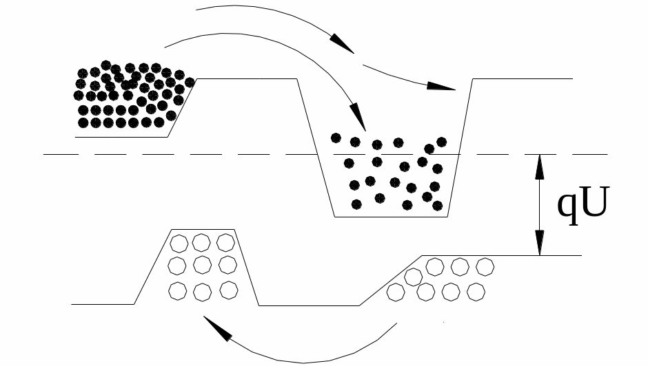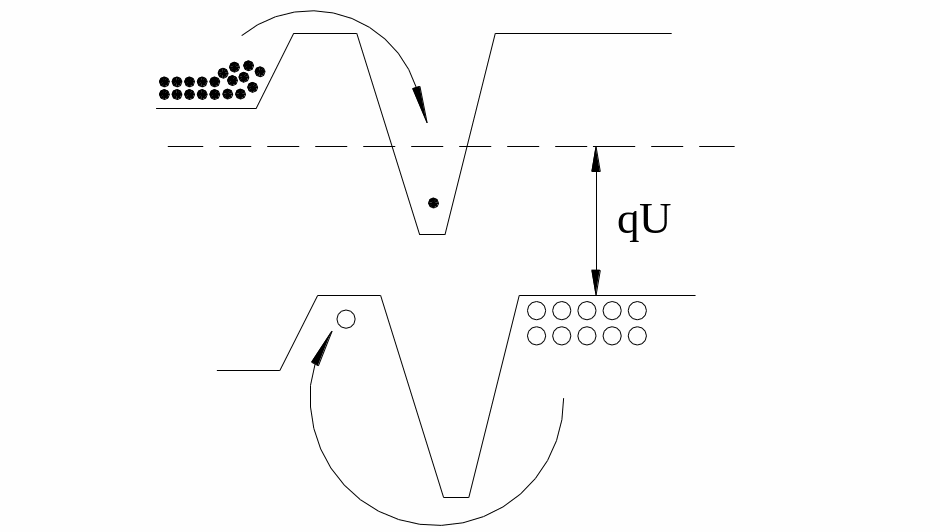 Большая часть прямого внешнего напряжения падает на коллекторном переходе, т.к он смещён в обратном направлении, поэтому первый участок ВАХ тиристора похож на обратную ветвь ВАХ выпрямительного диода. С увеличением анодного напряжения, увеличивается прямое напряжение и на эмиттерных переходах, электроны инжектированные из «n» эмит. в р – базу передвигаются к коллекторному переходу, втягиваются по полем и попадают в n – базу, дальнейшему продвижению электронов препятствует потенциальный барьер правого эмиттерного перехода, поэтому часть электронов, оказавшись в потенциальной n – яме, образуют избыточный отрицательный заряд, который понижая высоту потенциального барьера правого эмиттерного перехода вызывает увеличение инжекции дырок из р – эмиттера в n – базу. Инжектированные из р – эмиттера дырки подхватываются полем коллекторного перехода и переходят в р – базу. Дальнейшему их продвижению препятствует потенциальный барьер левого эмиттерного перехода, т.е в р – базе происходит накопление избыточного положительного заряда, что обуславливает увеличение инжекции электронов из n – эмиттера, таким образом в структуре тиристора существует положительная обратная связь по току, т.е увеличение тока через один эмиттерный переход приводит к увеличению тока через другой. Накопление зарядов в базовых областях равносильно дополнительной разности потенциалов на коллекторном переходе, которая стремится сместить этот переход в прямом направлении, т.е суммарное напряжение на коллекторном переходе будет уменьшаться, в результате высота потенциального барьера коллекторного перехода уменьшается до значения, соответствующего включению этого перехода в прямом направлении.