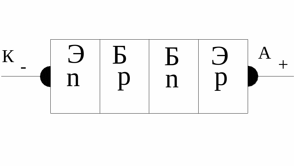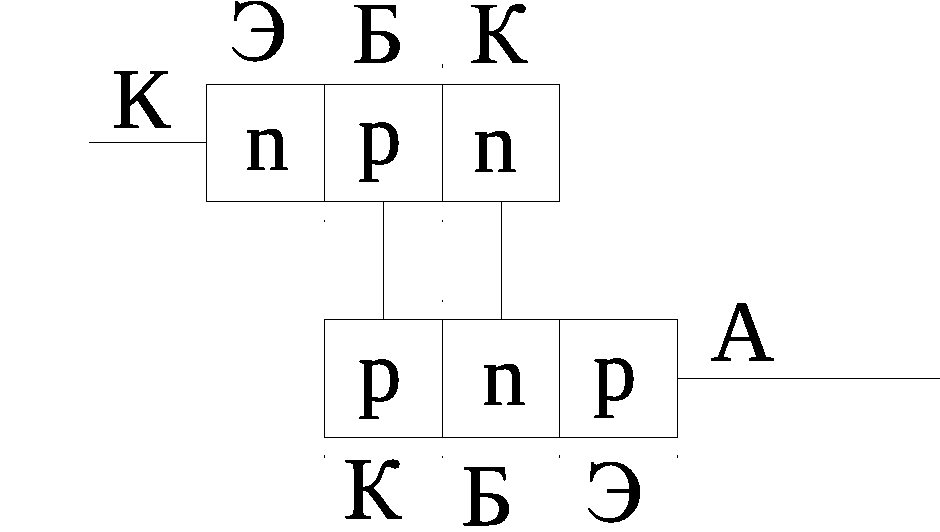 Таким образом (Iуд) это минимальный ток, который необходим для поддержания тиристора в открытом состоянии. Структуру тиристора можно представить в виде двух транзисторов: