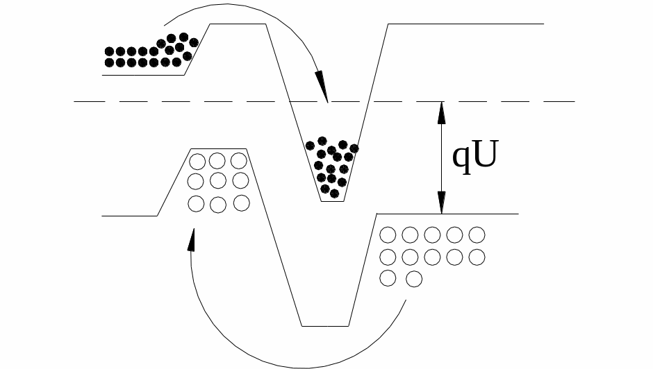 1) При подаче прямого напряжения. Дырки и электроны оседают в средней области «Р»