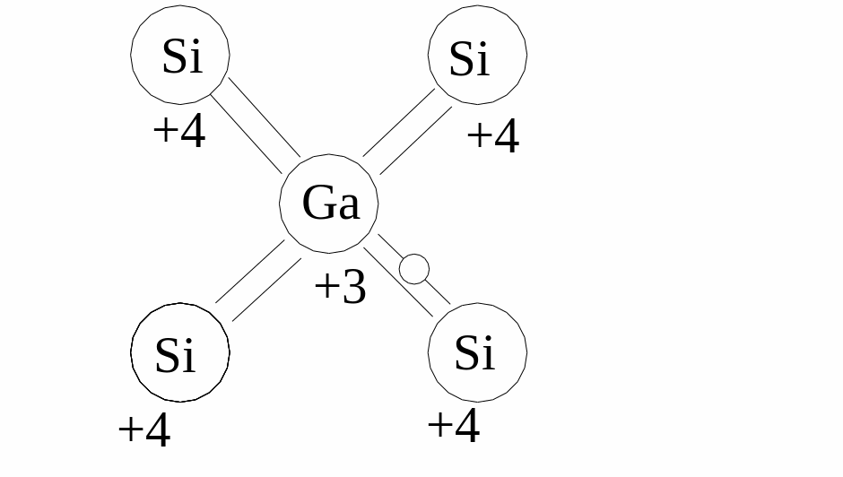 Полупроводник p – типа образуется путём добавления акцепторной примеси. Атом гелия имеет три валентных элемента. Они образуют ковалентную связь с тремя атомами кремния, при этом остаётся свободным один энергетический уровень в валентной зоне.