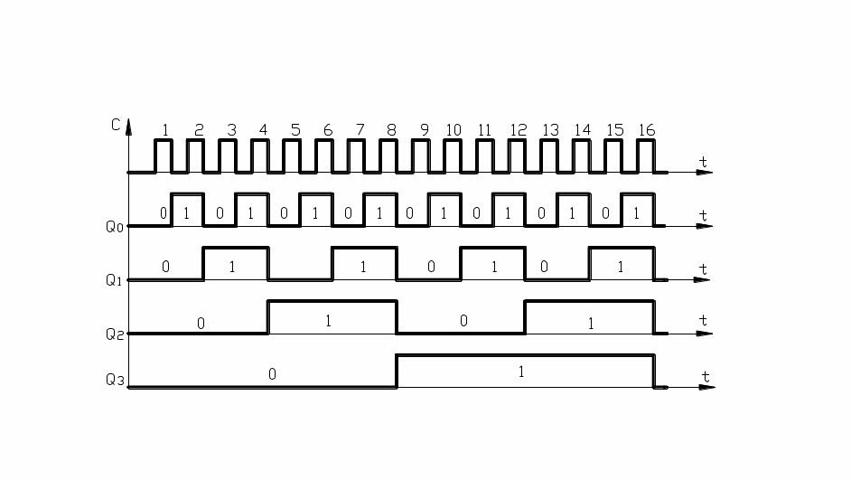 Рис. 11.25. Временные диаграммы работы двухтактного двоичного счётчика по модулю 16