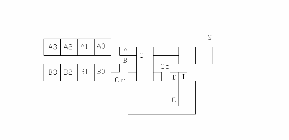 С первым тактовым импульсом осуществляется запись суммы младших разрядов в регистр суммы. Сигнал переноса появляется на выходе D-триггера и происходит сдвиг информации в регистрах А и В.