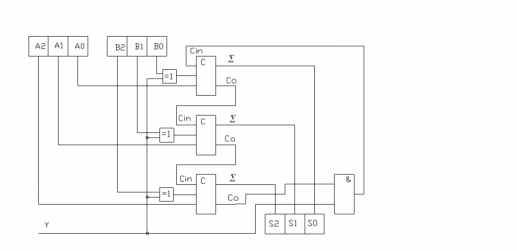 Если на вход Y подана «1» , то восстанавливается цепь сигнала последнего переноса с помощью элемента И, разряды числа «В» подаются на вход сумматоров с инверсией, следующее устройство работает как вычитатель.