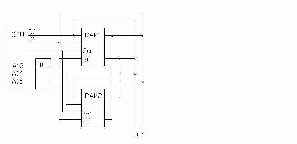 Микропроцессор ЦПУ(CPU) имеет 16-разрядную шину адреса. Три старших разряда используются для выбора микросхем ОЗУ с помощью дешифратора.