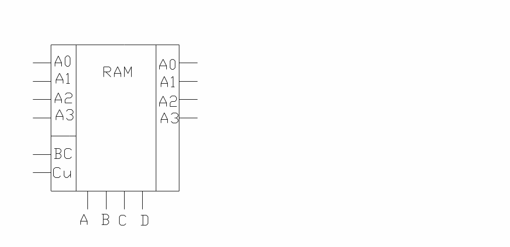 На входы A B C D подается адрес ячейки, при 1 на входе считывания, информация, записанная в этой ячейке, выдается наружу. И при 0 на входе происходит запись информации в эту ячейку.