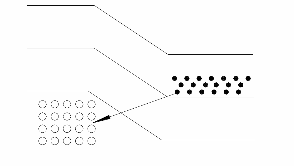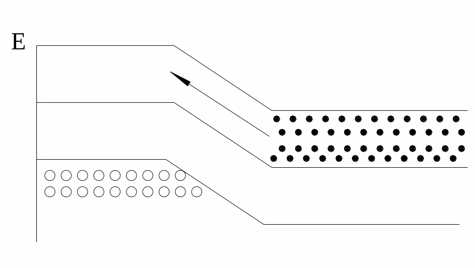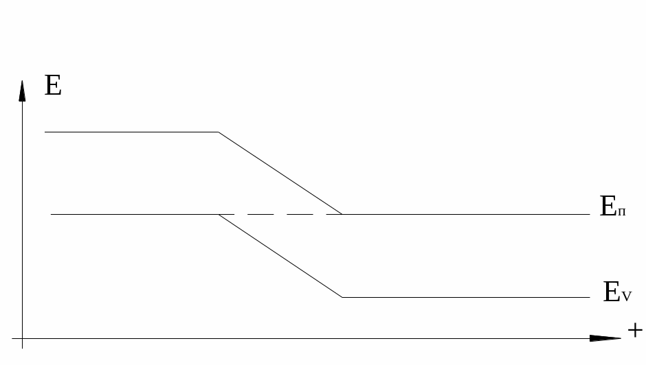 При дальнейшем увеличении прямого напряжения происходит выпрямление энергетической диаграммы. В результате туннельный эффект уменьшается, что приводит к снижению тока.