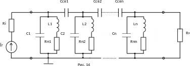 Используя цепочку СК (рис. 14), можно создать избирательную систему, у которой коэффициент прямоугольности АЧХ стремится к 1. Такие устройства называются фильтрами сосредоточенной селекции (ФСС). Однако, при увеличении количества СК возрастают вносимые потери в полосе пропускания ФСС и это ограничивает число используемых в цепочке контуров.