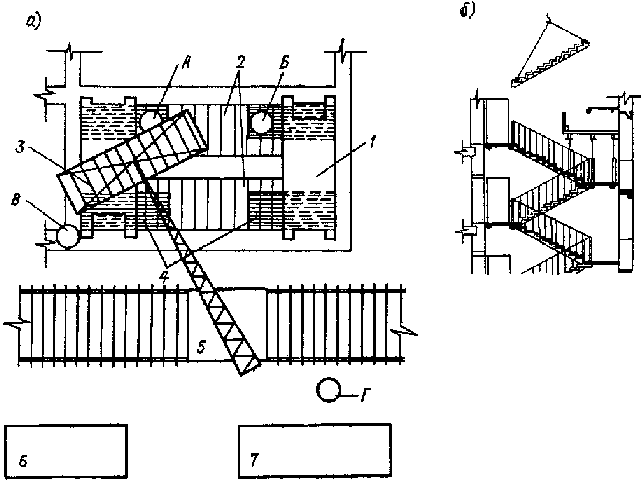 Лестничные площадки стропуют четырехветвевым стропом, а марши - четырехветвевым стропом с двумя укороченными ветвями. Находясь на площадках для сварщика, монтажники готовят растворную постель для площадок. При установке лестничной площадки ее положение проверяют при помощи деревянных шаблонов, которые прикладывают в выступы установленной и монтируемой площадок. Смещают конструкцию до проектного положения монтажными ломами. При установке лестничного марша монтажники находятся на верхней и нижней площадках. Основанием под опорные части марша служит слой раствора. На подготовленное основание опускают вначале нижний конец марша, а затем верхний. При одновременном опирании обоих концов элемента он может заклиниться, а при опирании вначале верхнего конца он может соскочить с зуба площадки. В обоих случаях возможна авария.