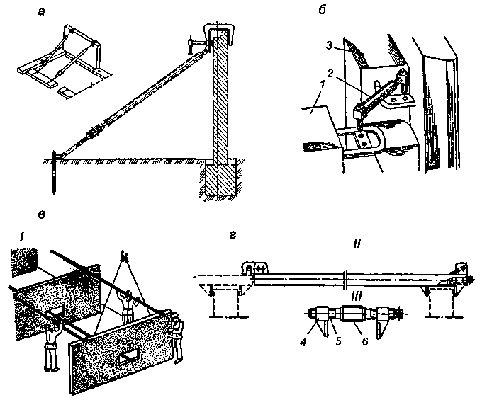 а - в - с помощью индивидуальных приспособлений; г-з - захватные устройства: г - винтовой зажим; д - струбцина; е - захватная головка укороченного подкоса; ж - нижний захват подкоса, закрепленный в отверстии плиты перекрытия; з - то же, за монтажную петлю в перекрытии; 1 - подкос; 2 - монтажная связь; 3 - монтажная опора.