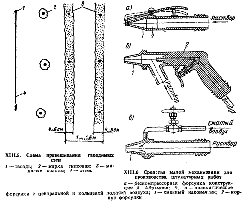 Питание форсунок раствором осуществляется растворонасосом, а сжатый воздух (при необходимости) подается от компрессора, поддерживающего давление в форсунке 0,05.,.0,1 МПа (рис. ХIII.6,в). Средняя производительность форсунок 900 м2 одного слоя в смену при производительности растворонасоса 3 м3/ч.
