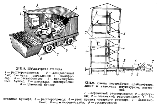 Переработку и подачу раствора к рабочему месту осуществляют с помощью передвижных штукатурных станций (рис. XIII.8). В комплекте станции, как правило, имеются приемный бункер для раствора, растворомешалка, вибросито, промежуточный бункер для перерабатываемого раствора, один или два растворонасоса с комплектом раствороводов, форсунки, компрессор. Компрессор нужен для очистки поверхностей и ДЛЯ нанесения на них раствора. Все оборудование смонтировано на двухосном автомобиле-прицепе. Раствор к рабочему месту подают растворонасосами плунжерного или диафрагменного типа производительностью 1...8 м3/ч.