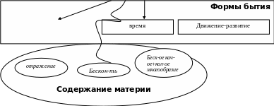 Принято различать прежде всего три важнейших атрибута материи, выступающие в качестве ее внутренних форм бытия (существования)' пространство, время и движение — развитие. К атрибутам материи относятся также еще ряд ее свойств несколько иного рода, или круга: отражение, бесконечность, бесконечное качественное и количественное многообразие материи. Если пространство и время — формы бытия материи, то бесконечное качественное и количественное многообразие характеризует содержание материи.
