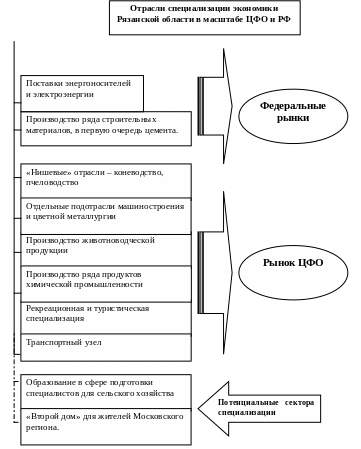 На федеральном уровне Рязанская область представлена только на рынке электроэнергии и ряда подотраслей топливной промышленности (бензина, дизельного топлива и т.д.) а так же строительных материалов (цемента, стеновых и кровельных материалов), в то же время, основная доля продукции так же потребляется Московским регионом.