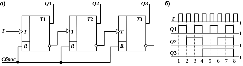 – Логические схемы Т-триггеров, преобразованных из D-триггера с динамическим управлением (а) и двухступенчатого RS-триггера (б)